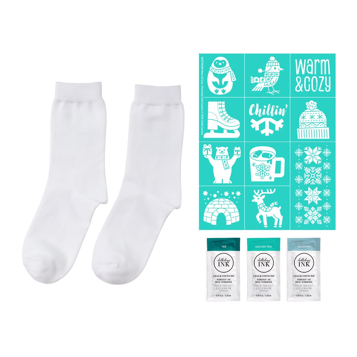 The December Club Couture™ project is just in time to get cozy! This month’s socks will keep your toes warm and the mini designs are so versatile! This month’s delivery includes the Warm & Cozy exclusive stencil design, a pair of white crew socks, and 3 ink packet singles in Tide, Couture Teal and Ocean Mist.